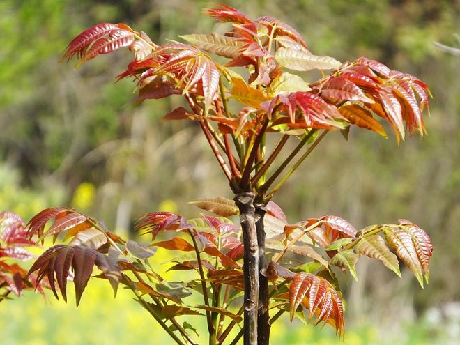 2. **菜椿**(Ailanthus altissima,俗称臭椿)属于苦木科臭椿属,虽与香椿同属无患子目,但亲缘关系较远。其嫩芽多为黄绿色,叶片为奇数羽状复叶,小叶基部有腺齿,揉搓后散发刺鼻异味(含挥发性物质如臭椿酮)。臭椿因生长快、耐污染,常作绿化树种,但全株有毒,不可食用。